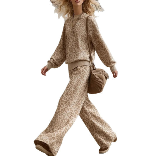 Women's Retro Casual Light Brown Leopard Print Long Sleeve Slim Fit Sweatsuit