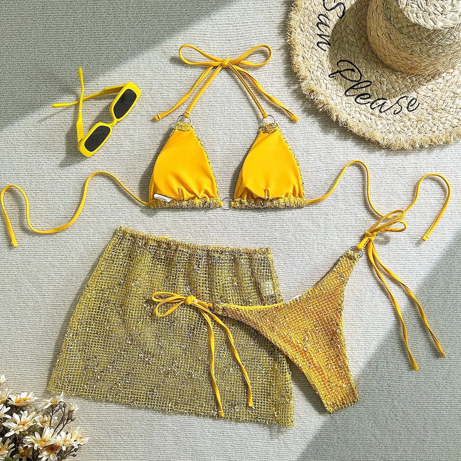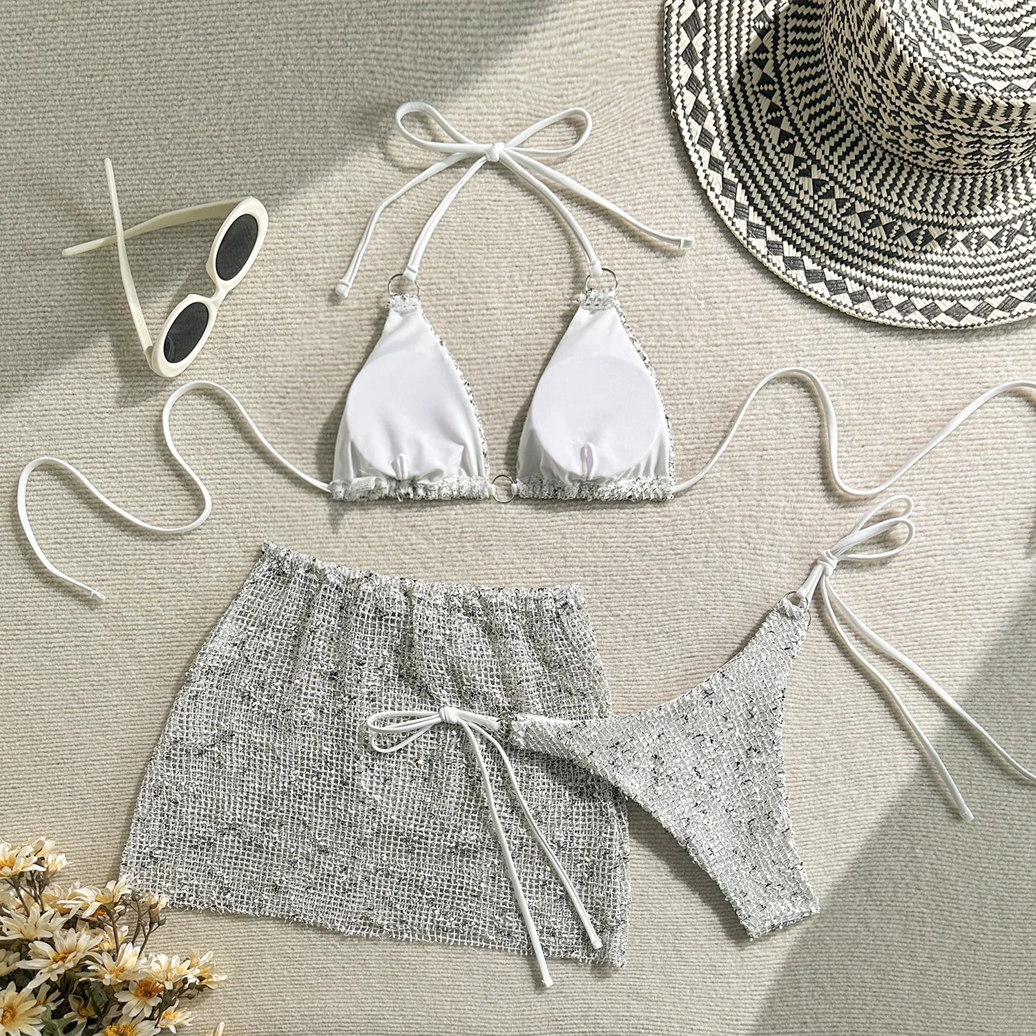Shiny White Bikini Set 2025 Women's push up cover up 3 Piece Swimsuit Mesh Beach Skirt Thong Metal Ring Swimwear Bathing Suit